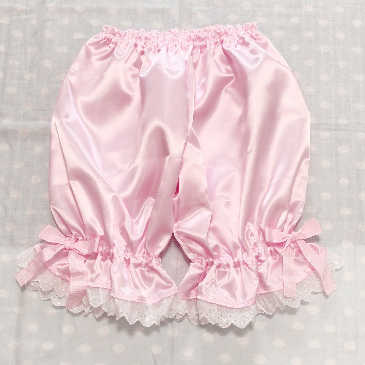 ピンクのサテン生地にレースとチェックのリボンがついたドロワーズです♡