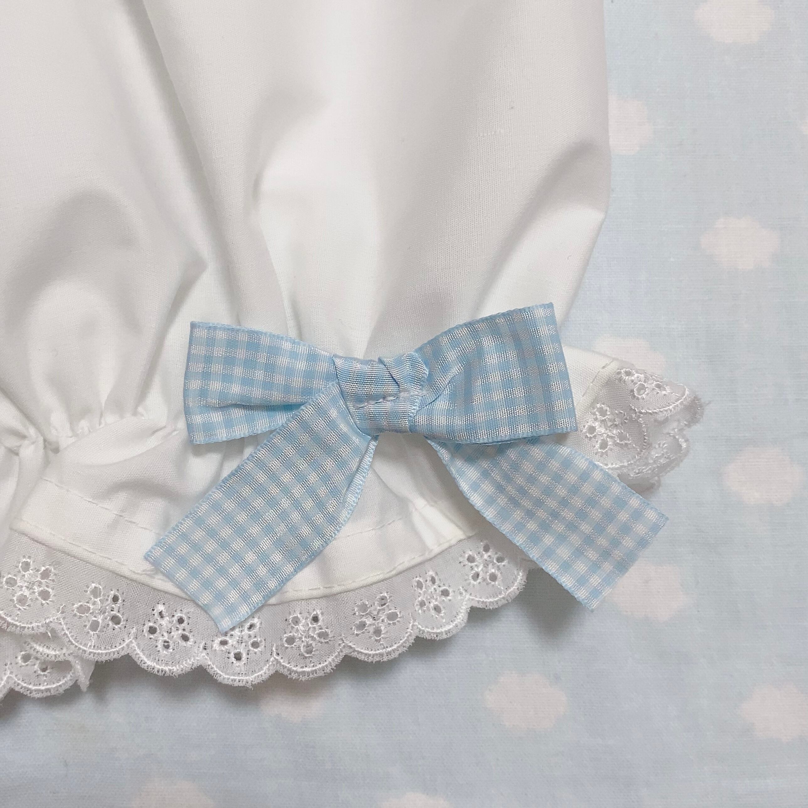 まっしろな生地に、チェックのリボンと一番星のボタンがついたシンプルなドロワーズです。